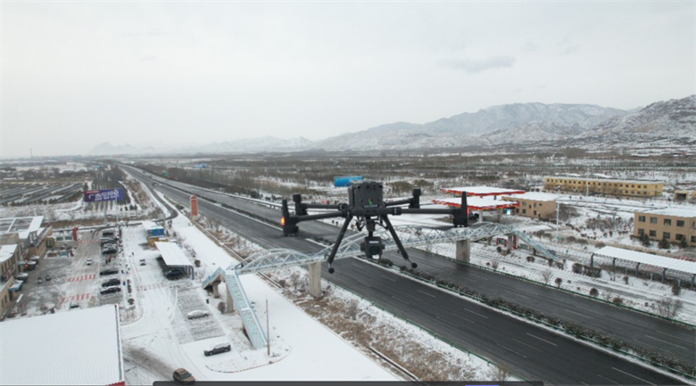 無人機(jī)在高速公路降雪巡檢中可以發(fā)揮重要作用,其優(yōu)勢(shì)不受路況和道路環(huán)境因素影響,憑借其靈活便捷、視野廣闊的優(yōu)勢(shì),能夠靈活、快速地對(duì)道路進(jìn)行全面檢查,快速飛抵積雪嚴(yán)重的路段,全方位、多角度地查看路面情況、車輛滯留狀況,為及時(shí)采取融雪除冰、交通疏導(dǎo)等措施提供了精準(zhǔn)的數(shù)據(jù)支持。相較于傳統(tǒng)的人工巡檢,大大提高了巡檢效率。