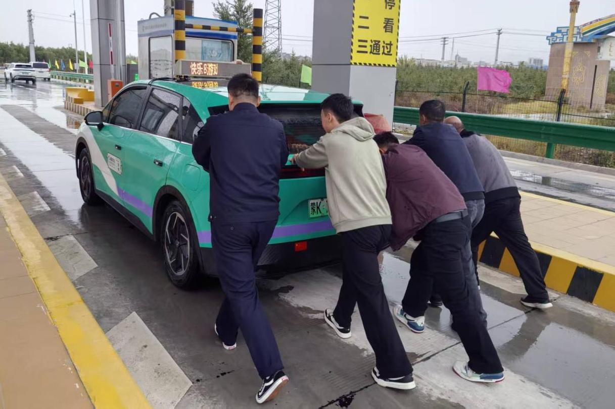 同日下午,一輛蒙k牌照的新能源車行駛至巴彥浩特南收費站因電量不足滯留收費車道。正值小雨天氣,加之雙節(jié)期間車流量較大,工作人員發(fā)現(xiàn)該情況后上報帶班所長。帶班所長迅速組織人員分頭行動,一隊對后方車輛進(jìn)行疏導(dǎo);另一隊冒雨推車至安全地帶。經(jīng)過二十分鐘的緊急處置,成功將故障車輛推至收費所就近充電點,成功解除難題。