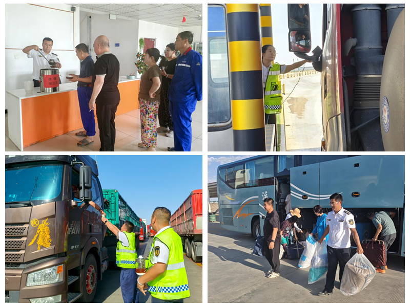 天鵝湖收費(fèi)所在收費(fèi)廣場(chǎng)設(shè)置臨時(shí)服務(wù)點(diǎn),每日10點(diǎn)至16點(diǎn)供應(yīng)綠豆水、涼白開及防暑用品;額濟(jì)納旗收費(fèi)所的黨員、青年志愿者守在便民服務(wù)臺(tái),提供急救藥品、維修工具,手繪加油站、充電樁分布圖為車主指路。