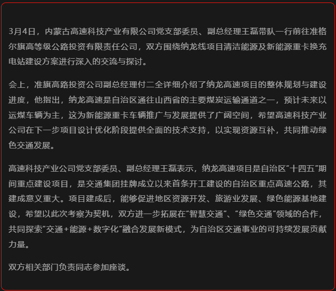 內(nèi)蒙古高速科技產(chǎn)業(yè)有限公司前往準(zhǔn)格爾旗高等級(jí)公路投資有限責(zé)任公司座談交流