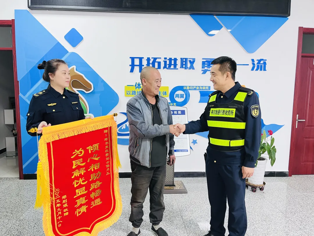 “真是太感謝你們了!我的車突然爆胎起火,我當(dāng)時(shí)腦子一片空白,幸好有你們出手相救!”近日,貨車司機(jī)鄭師傅專程來到布爾敦收費(fèi)所,將一面印有“傾心相助路暢通,為民解憂顯真情”的錦旗遞到工作人員手中,再三表達(dá)感激之情。