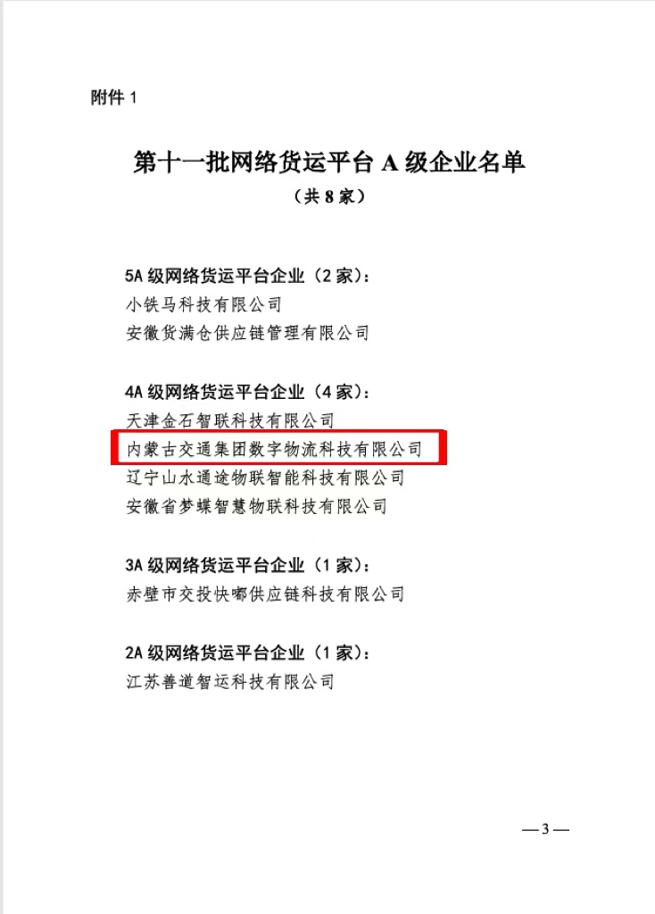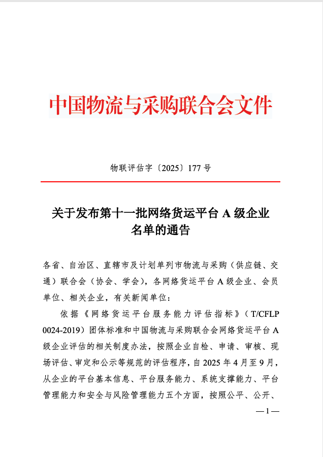 9月27日,根據(jù)中國(guó)物流與采購聯(lián)合會(huì)《關(guān)于發(fā)布第十一批網(wǎng)絡(luò)貨運(yùn)平臺(tái)A級(jí)企業(yè)名單的公告》(物聯(lián)評(píng)估字〔2025〕177號(hào)),內(nèi)蒙古交通集團(tuán)數(shù)字物流科技有限公司被授予“網(wǎng)絡(luò)貨運(yùn)平臺(tái)4A級(jí)企業(yè)”稱號(hào)。這不僅是對(duì)公司扛牢使命職責(zé)、奮力推動(dòng)發(fā)展的肯定,更為公司做強(qiáng)做優(yōu)數(shù)字物流產(chǎn)業(yè),帶動(dòng)引領(lǐng)自治區(qū)物流產(chǎn)業(yè)向集約化、數(shù)字化、規(guī)?;较虬l(fā)展提供了強(qiáng)大動(dòng)力。