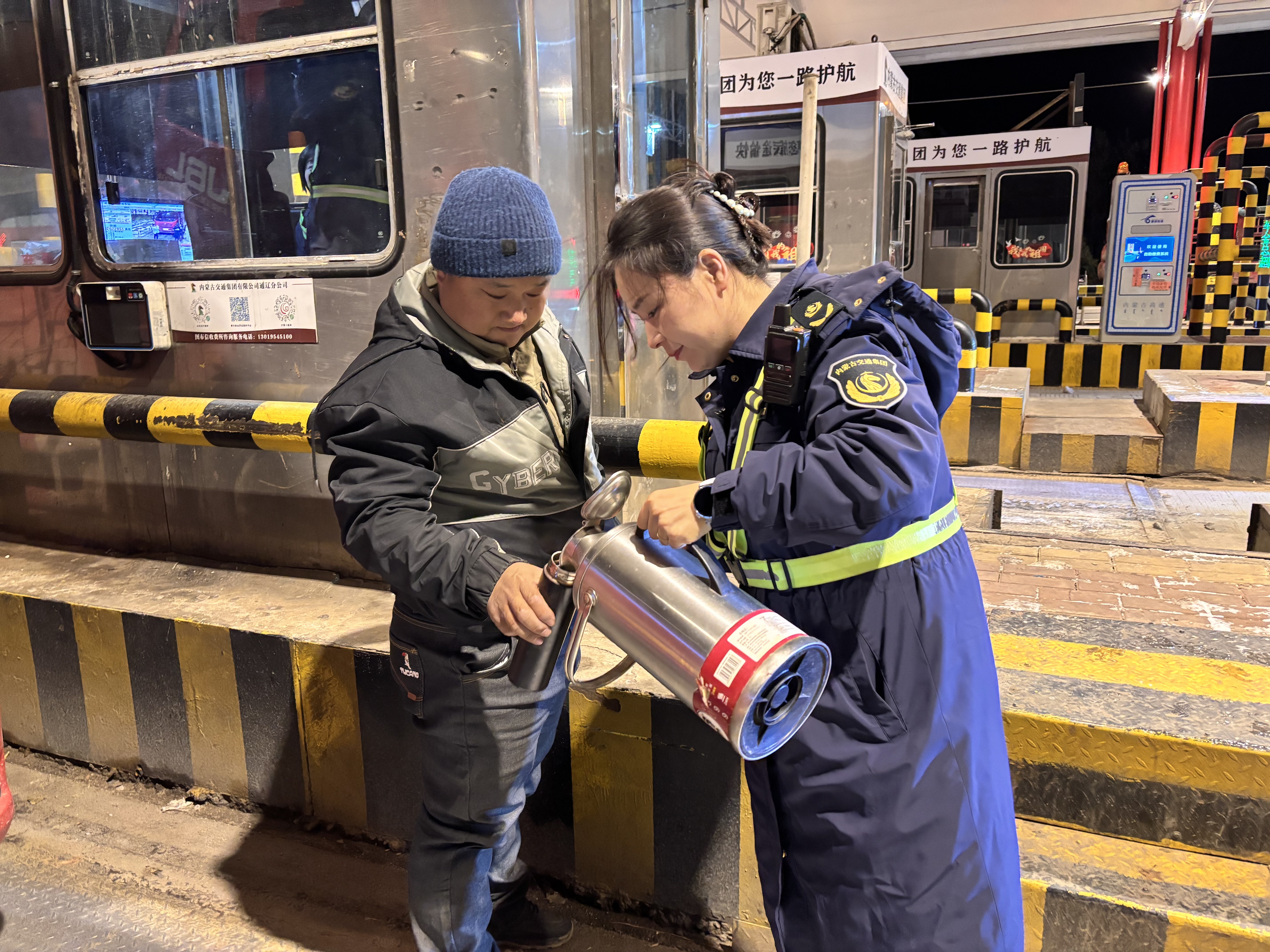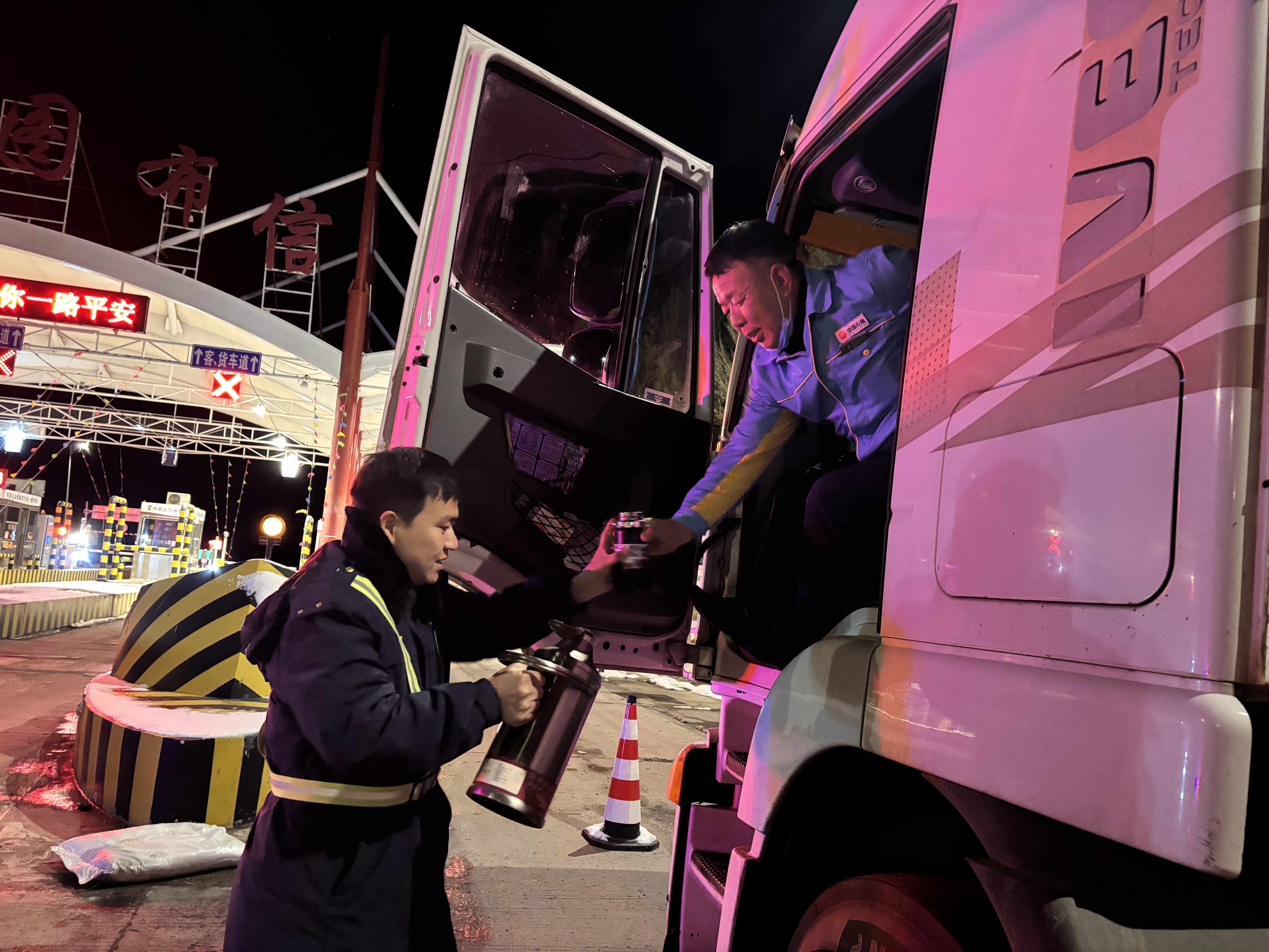 此外,所內工作人員為焦急等待的司機們送去一杯杯熱飲。“師傅,天冷,喝杯熱水暖暖身子吧!”“需要加水嗎?我們這有熱的!”一句句暖心的話語,伴隨著氤氳的熱氣,傳遞到每一位司乘手中。一位掛車司機接過熱水,激動地說:“這雪下得突然,堵在路上又冷又心煩,你們這杯熱水,真是雪中送炭?。√兄x了!”
